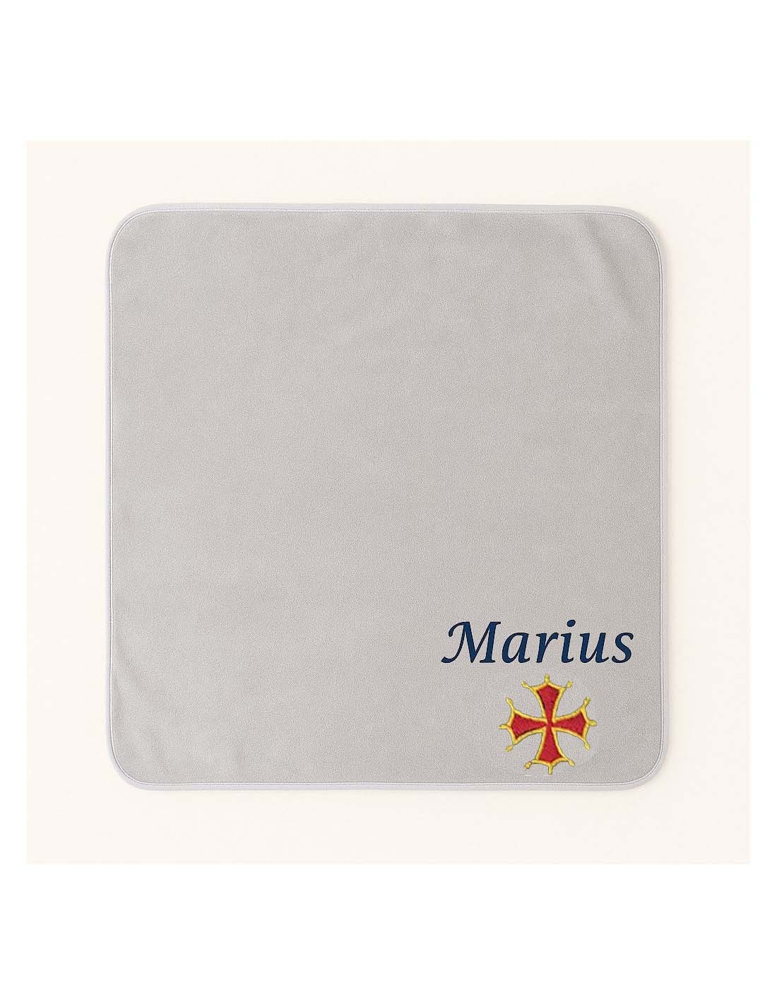 Le motif est brodé sur le plaid et le prénom au dessus du motif.