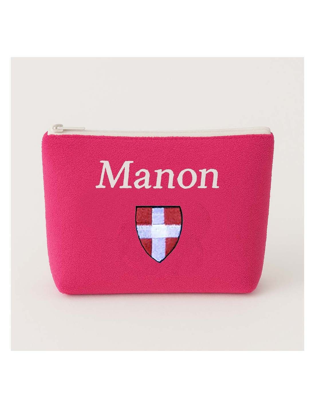 Le motif est brodé est brodé sur un côté de la trousse et le prénom au dessus du motif.