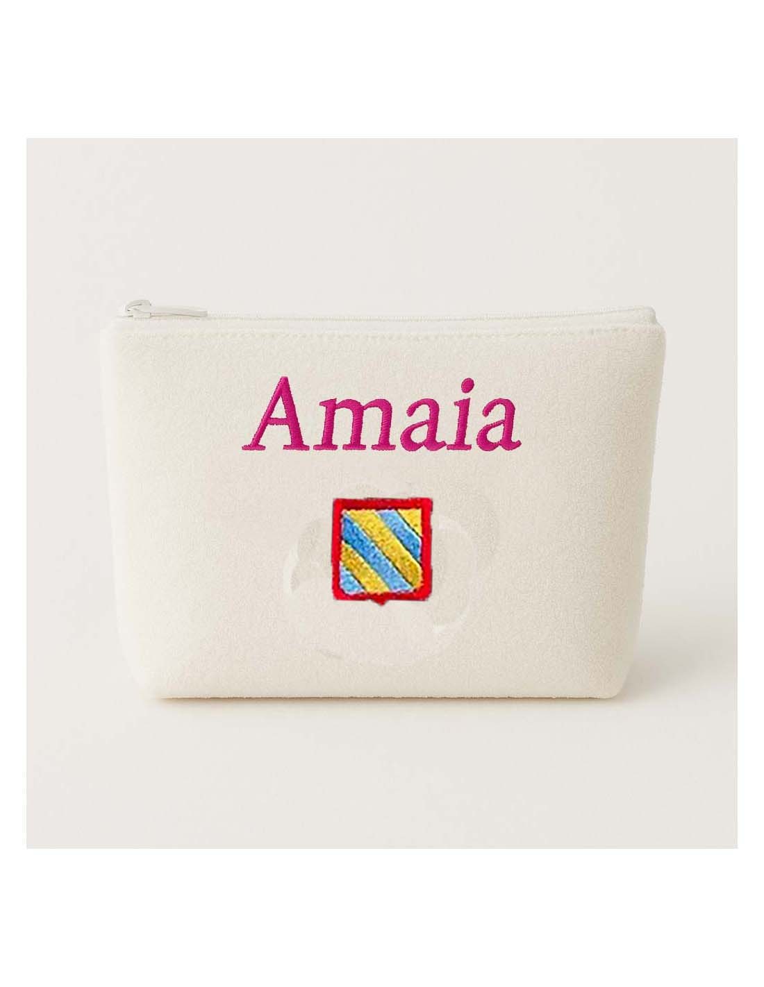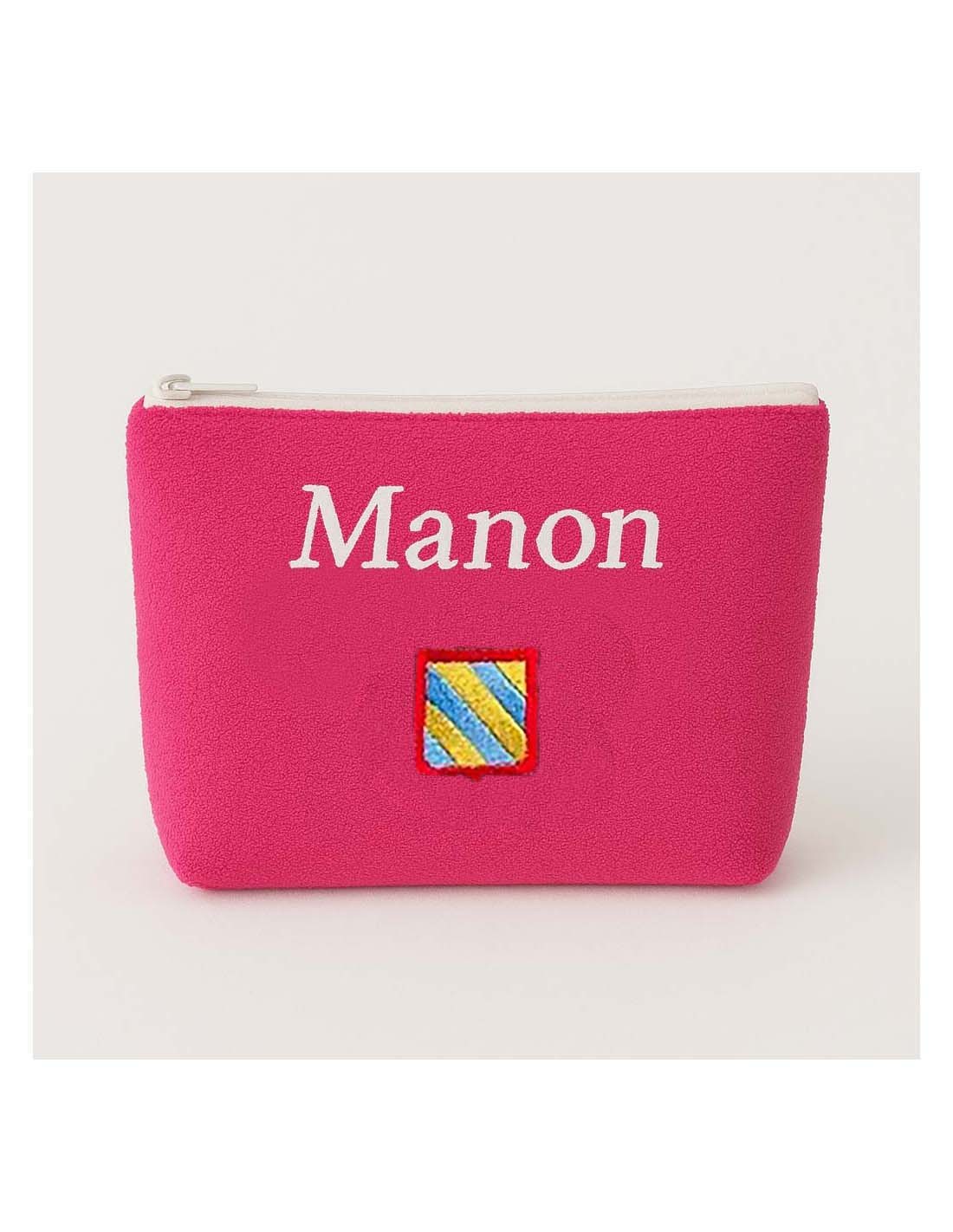 Le motif est brodé est brodé sur un côté de la trousse et le prénom au dessus du motif.