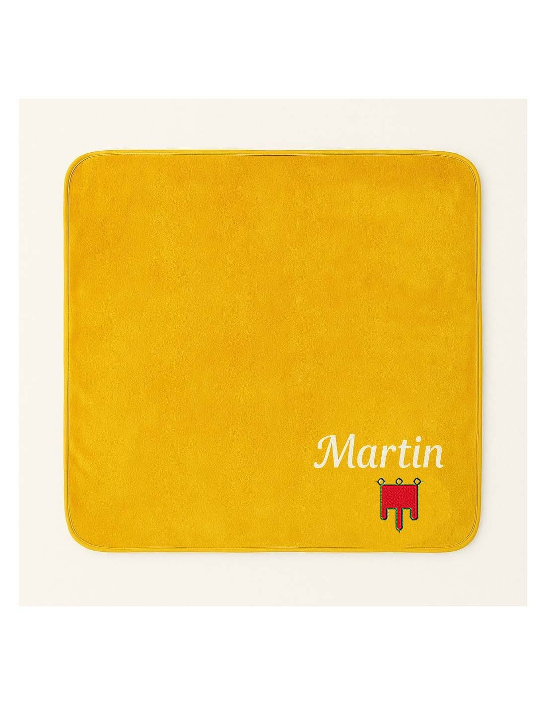 Le motif est brodé sur le plaid et le prénom au dessus du motif.