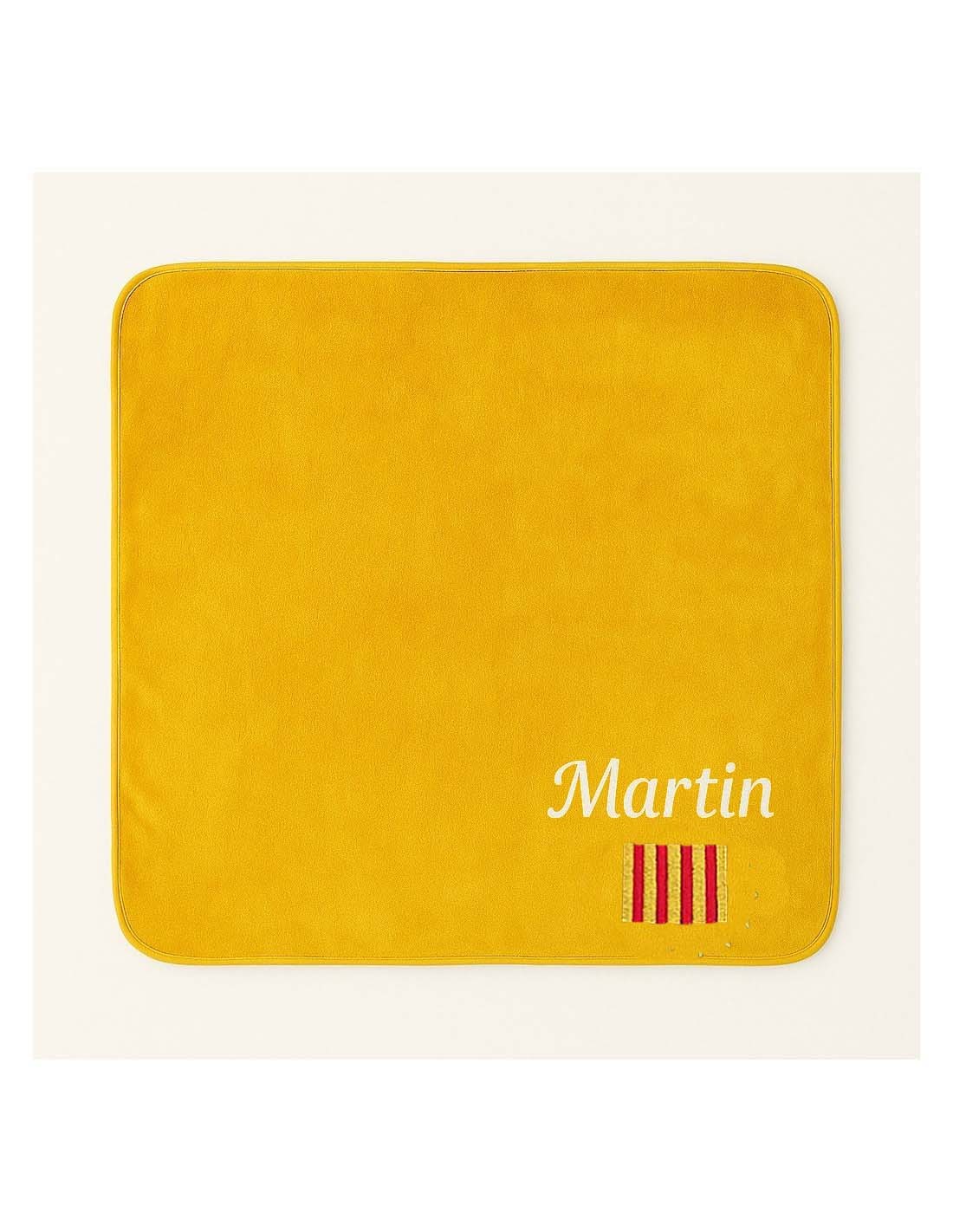 Le motif est brodé sur le plaid et le prénom au dessus du motif.