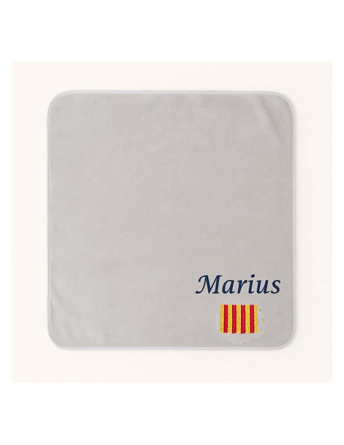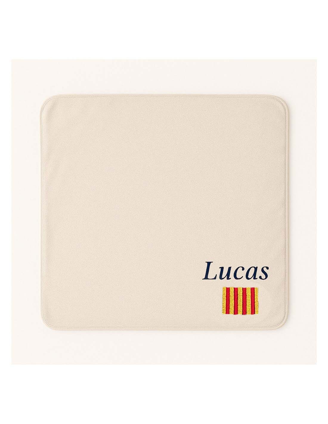 Le motif est brodé sur le plaid et le prénom au dessus du motif.