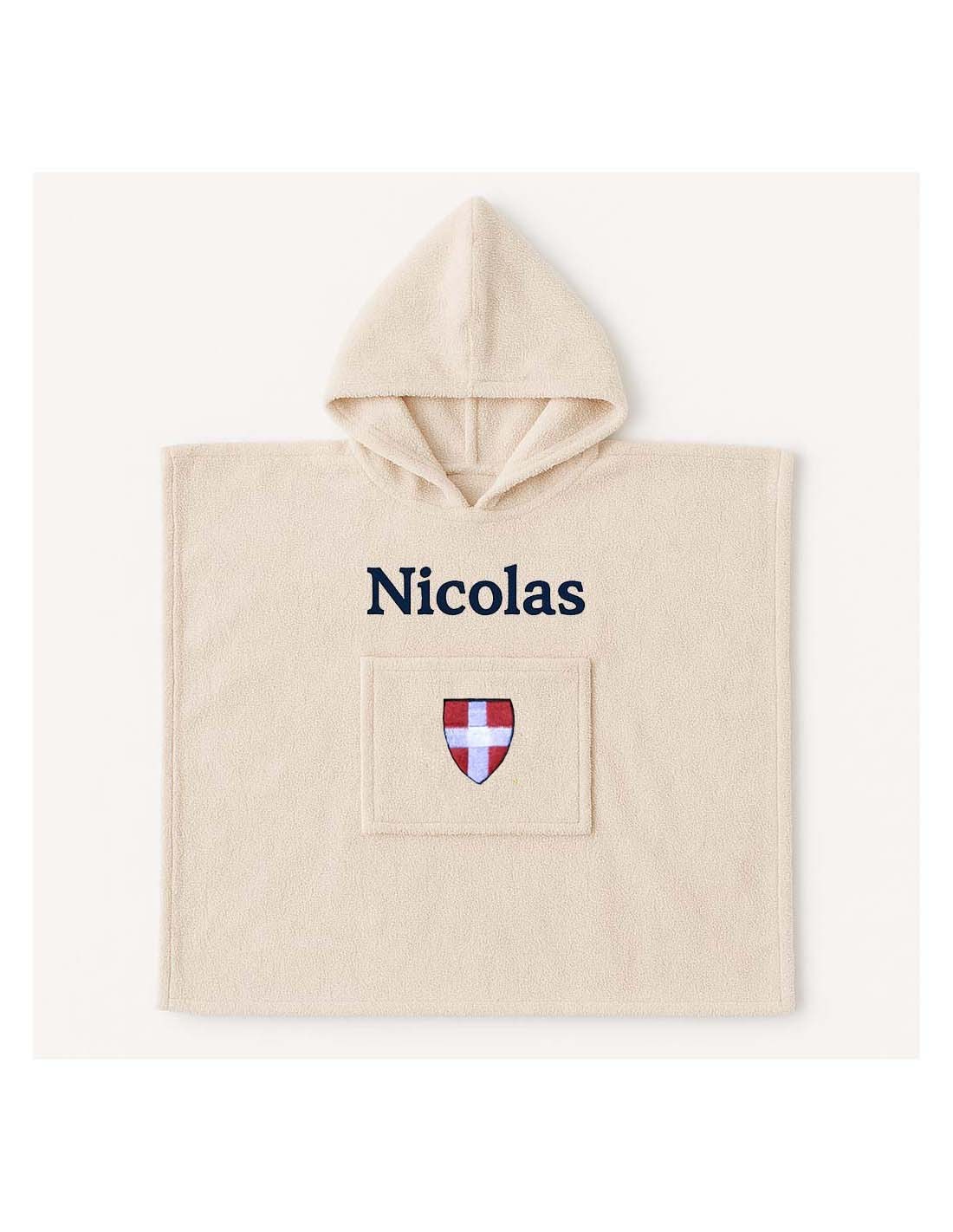 Le motif est brodé sur la poche du poncho et le prénom au dessus de la poche.
