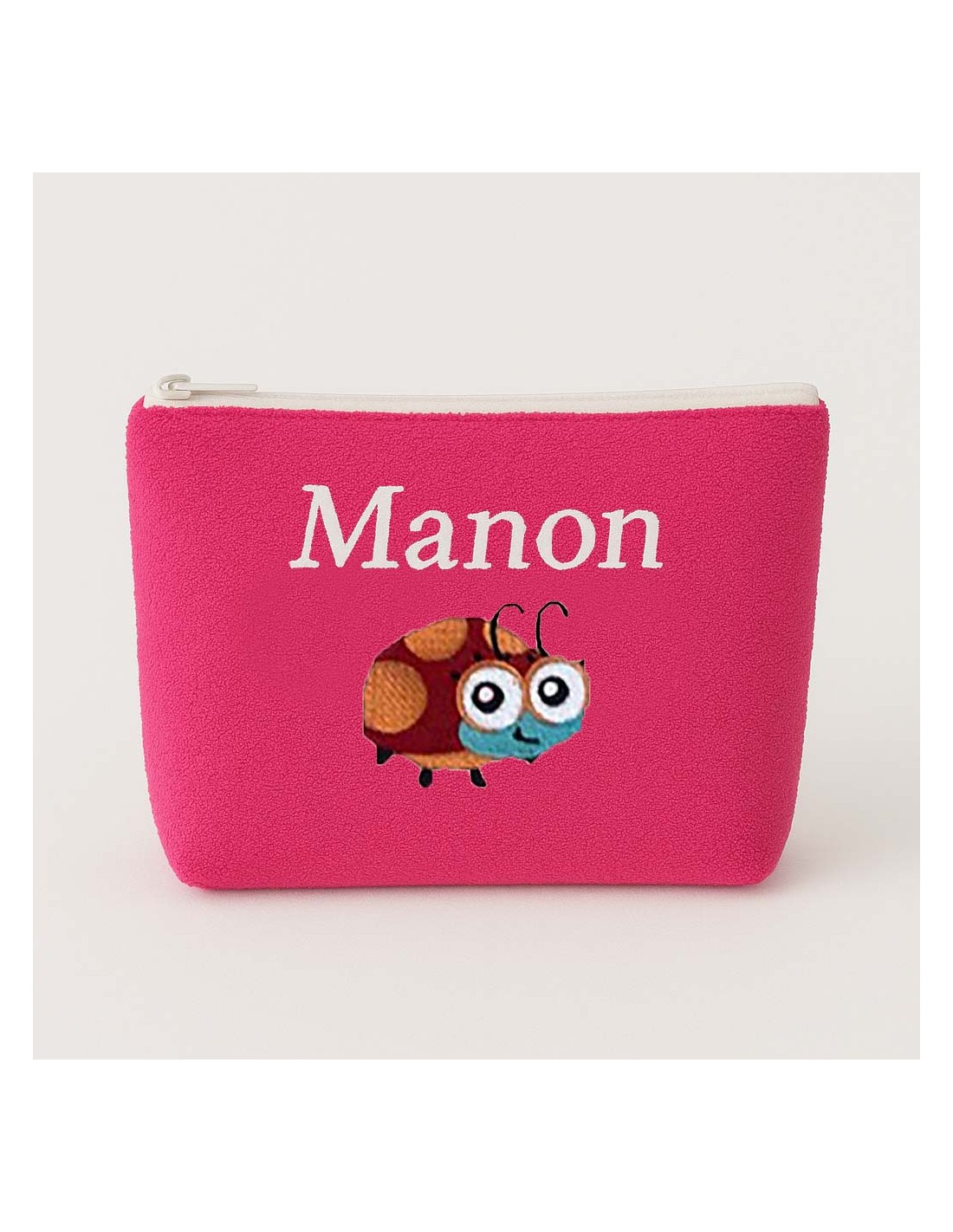 Le motif est brodé est brodé sur un côté de la trousse et le prénom au dessus du motif.